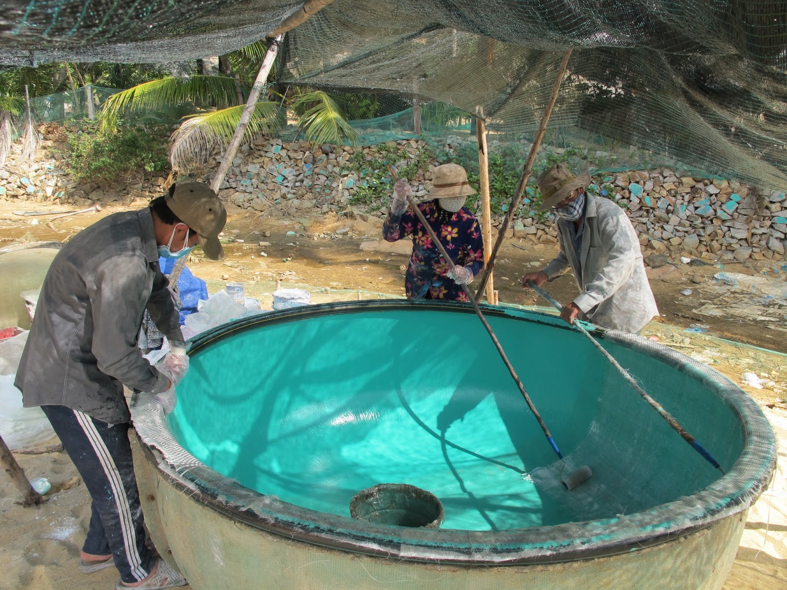 | Here at Hoa An there's hardly any boat at work that isn't a plastic tub. The beach is a little flatter and the people here launch and retrieve their tubs with little hand-pulled trolleys. Pretty work able. |